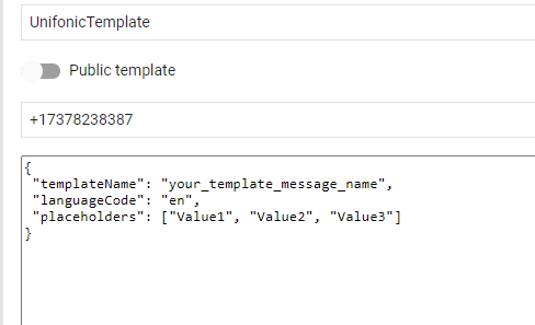 The content is a JSON based configuration that will allow you to set the name of the template message that you would like to use for your first interaction and have defined in your Unifonic account, the language code and you have defined any placeholders you can add optional place holder values.&#x20;