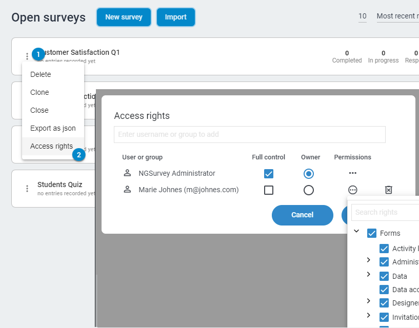 Umfragen sind nur für den Benutzer sichtbar, der sie erstellt, und für ngSurvey-Administratoren. Es ist jedoch möglich, anderen Benutzern des Systems Zugriff zu gewähren und festzulegen, was der Benutzer mit der Umfrage tun darf oder auf welche Abschnitte er zugreifen kann.