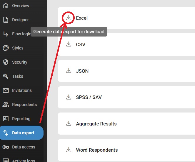Gehen Sie zu **Data Export** und klicken Sie auf das kleine Pfeilsymbol neben der **Excel** Formatoption, um die Datenexportdatei zum Herunterladen zu erzeugen.