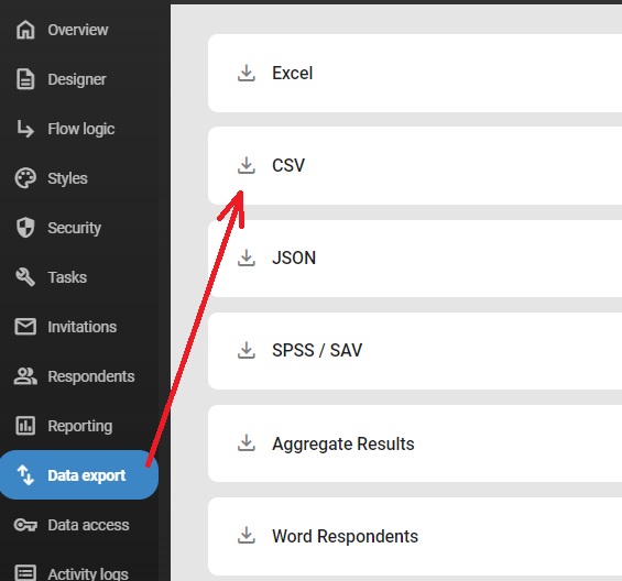 * Gehen Sie zum [**Data export** ](https://docs.ngsurvey.com/de/form-management/data-export)in der linken vertikalen Symbolleiste.&#x20;