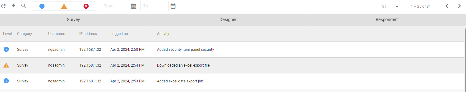 By default the activity log data will be stored in the ngSurvey database but its also possible to forward the activities to a [third party logging system](https://docs.ngsurvey.com/installation-setup/installation/monitoring-and-logging).&#x20;