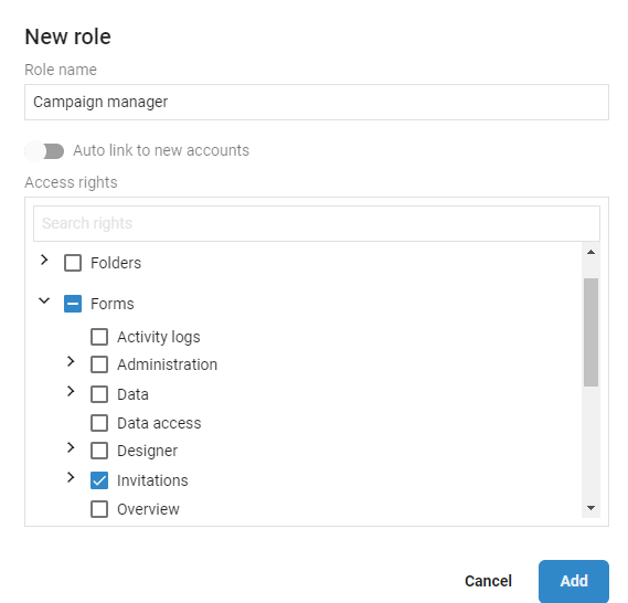 To create a role click **Add new role**  and compose your role using the rights you want to give to the users or groups to which this role will be assigned to&#x20;