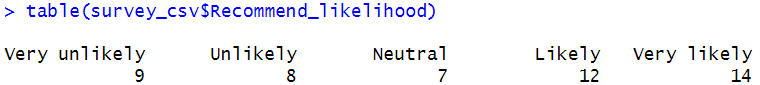 * **Output**: The frequency table shows how often each category of recommendation likelihood occurs in the dataset.
